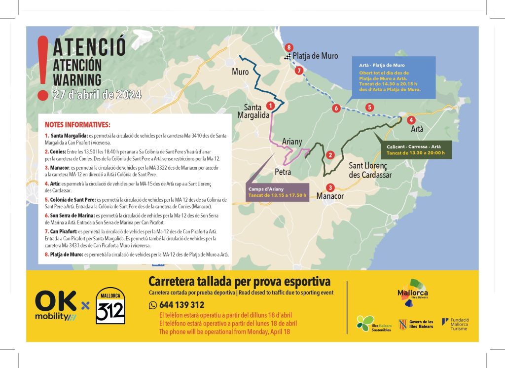 mallorca312.com i als telèfons habilitats. I, si no participau, no deixeu de passar per l’avituallament d’Artà dia 27, animar als ciclistes i gaudir d’un dia per a les bicicletes.