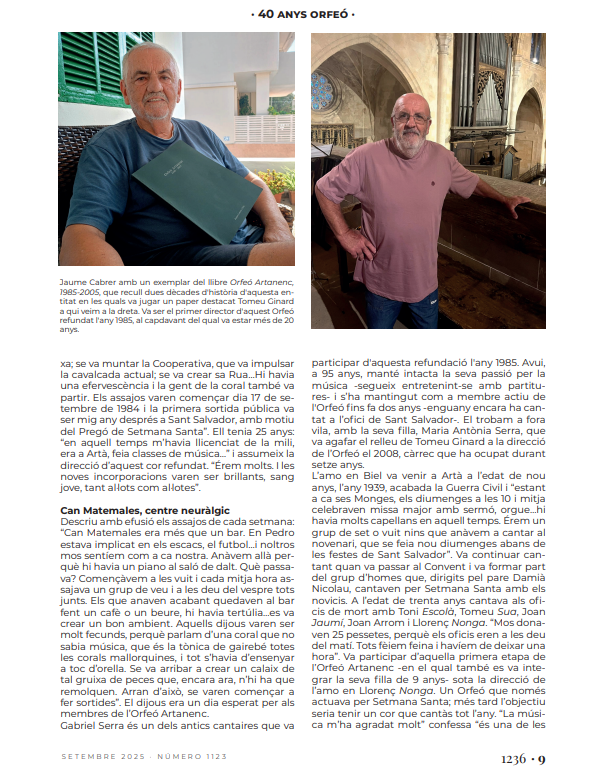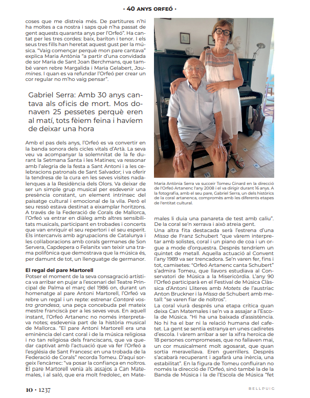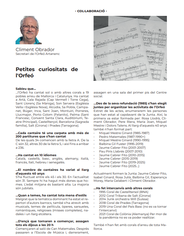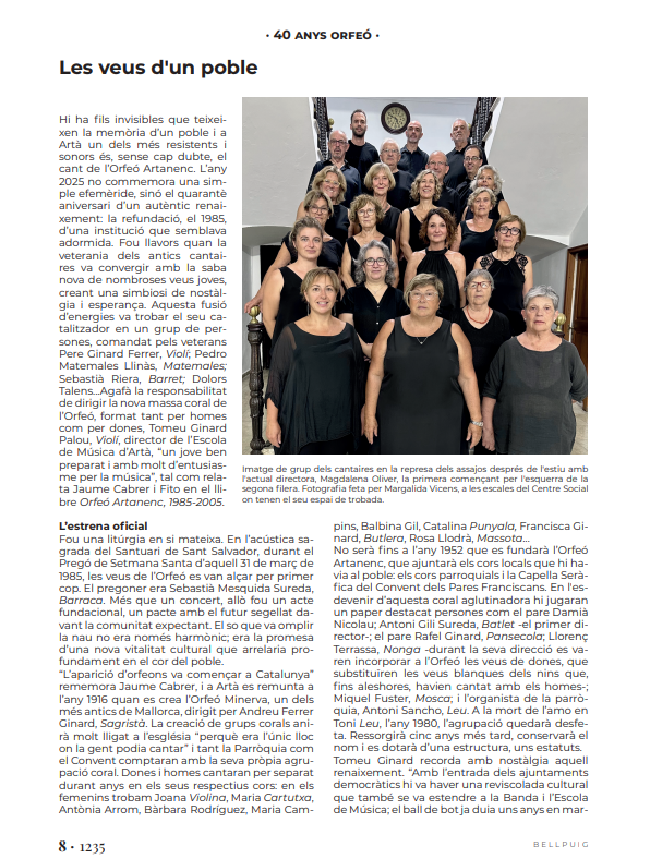El pròxim 25 d’octubre, a les 21 hores el Convent dels Pares Franciscans acollirà un concert especial per commemorar el 40è aniversari de l’Orfeó Artanenc. Presentat per Miquel Mestre, els cantaires oferiran diferents peces sota la direcció dels tres directors que ha tengut des de la seva refundació com a cor l’any 1985: l’actual, Maria Magdalena Oliver, Maria Antònia Serra i Tomeu Ginard. Hi participaran antics cantaires que han format part de l’agrupació al llarg d’aquests quaranta anys i el públic assistent també podrà unir la seva veu al cor amb motiu de la interpretació de la Balanguera. Hi haurà taquilla inversa, a fi que sigui l’espectador qui decideixi el preu que vol pagar per l’actuació. Hi estau ben convidats!