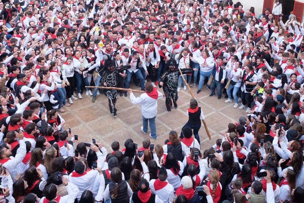 A les vuit i mitja del dematí per tot hi ha gent, i aquella remor ara ja són crits i càntics de joves, nines, padrins, mares, amics i convidats que es dirigeixen a ca s’Obrer, perquè en poc temps s’obriran les portes de can Pere Pep Gil perquè surtin els dos dimonis, el gros i el petit.