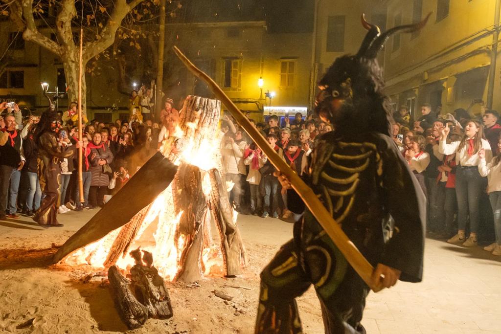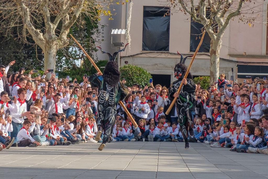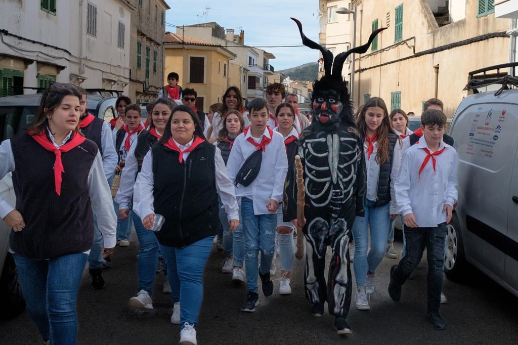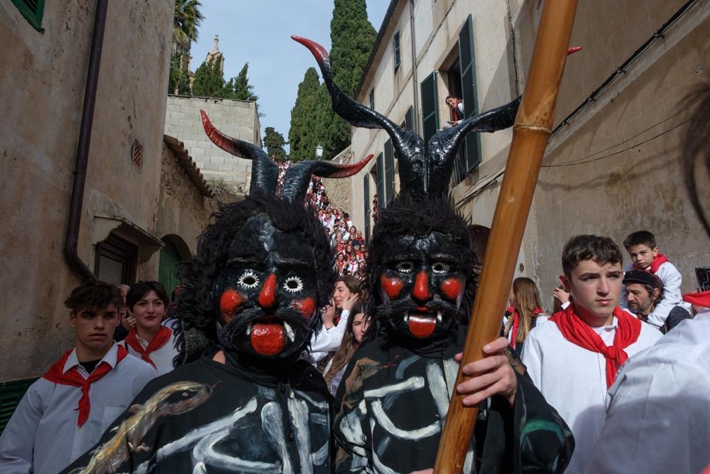 Seguim. Els dimonis no toquen la porta, entren. Qui toca és la banda. En Mosca i en Ferriol ja són dins es Pou de sa Lluna. Les mestres ploren d’emoció. Els menuts ploren de por. No tots, molts riuen, perquè tot i que cap d’ells no recorden els dimonis i la majoria no els havia vist mai, n’han sentit xerrar molt, tant, que eren talment se’ls havien imaginat. Això es repeteix a na Caragol, a l’IES, a Sant Salvador i a Sant Bonaventura. Un temps, conten els que tenen més de cinquanta anys, els dimonis eren sobretot cosa de nins, que els veien ballar i ballaven amb ells en una rotllana enorme. Seria bo reivindicar aquell record. Avui els joves i adults s’han fet l’acapte seu, i els nins, pujats a braços o a les espatlles de mares i pares, fan el que poden per veure ballar els representants de l’infern.