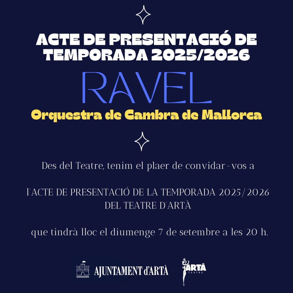 Anam a començar la temporada amb un Cicle Simfònic i anam a portar dues orquestres professionals i dues bandes de música de Mallorca. Seran l’Orquestra de Cambra de Mallorca i l’Orquestra de la Fundació 1830, la primera dirigida per Bernat Quetglas i la segona per Fernando Marina. Al novembre vendrà la Banda de Música d’Artà, com a amfitrió d’aquest cicle simfònic, i al desembre anam a fer un simfònic del grup Roada, que és un grup de música tradicional, que han fet uns arranjaments simfònics i seran interpretats pel mateix grup i la banda… No ho desvetllem tot ara! Al Nadal farem un concert amb els solistes artanencs Antoni Lliteres i Maria Caballero. Són dos cantants molt reconeguts dins l’àmbit nacional, molt estimats dins Artà, i la gent demana venir-los a escoltar. Serà un dels concerts de Nadal.