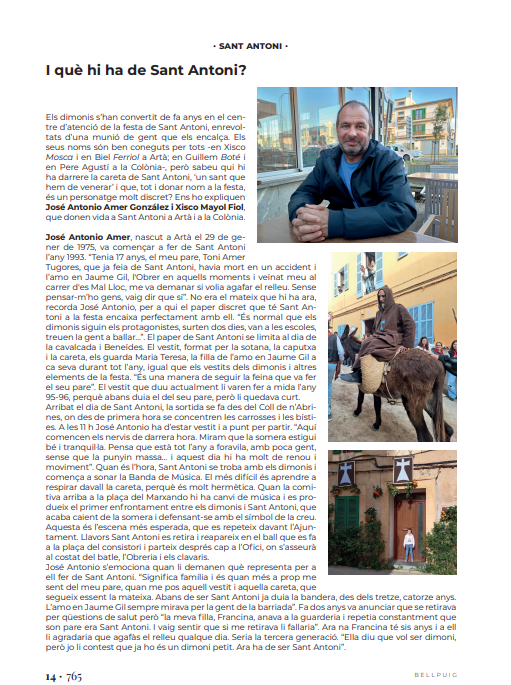 Aquest cap de setmana els dimonis tornaran a fer-ne de les seves per la Colònia de Sant Pere amb el tradicional acapte, Completes, encesa de foguerons…i a la cavalcada i les beneïdes tornarem a veure, un any més, el personatge que dona nom a la festa: Sant Antoni. Avui vos oferim en obert una altra de les informacions del darrer número de la revista Bellpuig que ha reunit als Sant Antoni d’Artà i de la Colònia per conèixer-los una mica més de prop.
