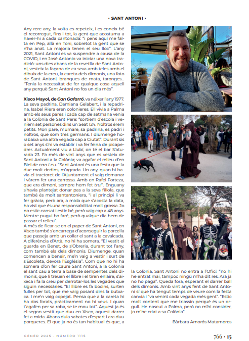 No hi ha dubte que els dimonis s’han convertit de fa anys en el centre d’atenció de la festa de Sant Antoni, enrevoltats d’una munió de gent que els encalça per veure’ls ballar pels carrers del poble. Els seus noms són ben coneguts per tots -en Xisco Mosca i en Biel Ferriol a Artà; i Guillem Llabrés i Pere Agustí a la Colònia-, però sabeu qui hi ha darrera la careta i el vestit de Sant Antoni, ‘un sant que hem de venerar’ com diu la glosa i que, tot i donar nom a la festa, és un personatge força discret? Enguany hem volgut conèixer de més a prop José Antonio Amer González i Xisco Mayol Fiol que donen vida, any rere any, a Sant Antoni a Artà i a la Colònia, respectivament. Una curiositat per començar: tots dos varen coincidir fent el servei militar a Palma.